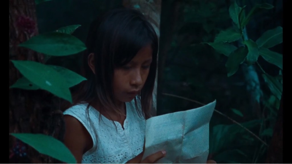 El río es el territorio de encuentro donde siempre se vuelve. El aseo personal, el lavado de la ropa y las conversaciones cotidianas ocurren allí. Asimismo es testigo privilegiado de los grandes acontecimientos que marcan la historia del pueblo, como la despedida de los hombres tras ser convocados para integrar la Guardia Rural Indígena -milicia creada durante la dictadura militar donde los indígenas aprendieron métodos de tortura, como el pau de arara, para reprimir a lxs habitantes de sus propias aldeas- mientras las mujeres lloran al creer que no volverán a verlos, les imploran que no vayan, les aseguran que los están engañando. En paralelo, una joven lee un documento de la Fundación Nacional del Indio (FUNAI) cuyo papel ambiguo ha prometido políticas en defensa de lxs indígenas a la vez que colaboró en sus intentos de exterminio.