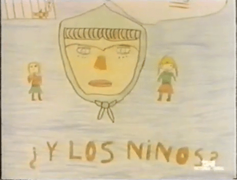 El método de búsqueda cambia: ya no se supone como un acto individual, tal y como vimos en los testimonios precedentes, sino que se asume de forma colectiva. No se habla exclusivamente del caso de una familia, sino como una acción conjunta con la finalidad de restituir las identidades de lxs nietxs apropiadxs. Una búsqueda que se organizó en la conformación de Abuelas de Plaza de Mayo, desde donde se plantearon recopilar la información y visibilizar los secuestros y desapariciones. Ese gesto, que no se agota en el caso personal, pretende incluir a toda la sociedad, entrar en diálogo y generar conciencia en el resto para que se comprometa en su lucha. Con esta intención, Antonia y María llegan hasta una clase de pintura en una escuela de Madrid donde conversan junto a niñxs interesadxs por conocer acerca de lo ocurrido. La información que surge de la charla es convertida en dibujos que lxs alumnxs realizan a partir de sus interpretaciones: cárceles, abuelas que reclaman, militares que apuntan, soles con lágrimas.